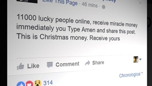 We’ve seen a rise in posts purporting to offer “Christmas miracles” for those that type amen on a post, as well as others that capitalise on the connection that Christmas has with religion.