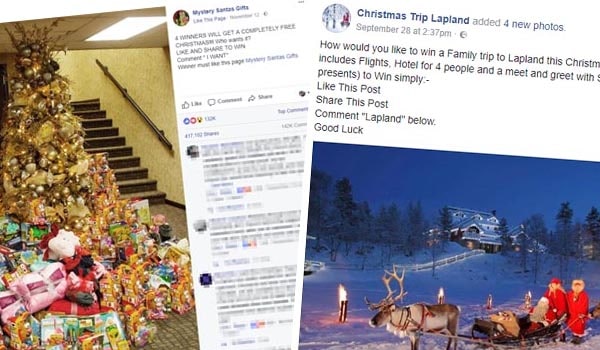 An example of a fake Facebook post using trips to Lapland or free presents as bait.