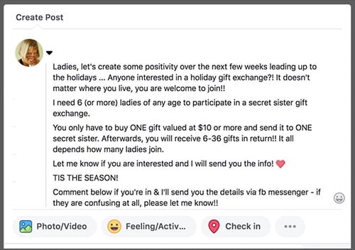 Gift exchange “programs” are very popular at this time of year. They promise the return of dozens of gifts in exchange for one. For example, a popular example known as the “Secret Sister Gift Exchange” instructed participants to purchase 1 gift valued at $10 and send it to a “secret sister” and in return you would receive 36 gifts in return, providing you recruited six other “sisters” to the same scheme.