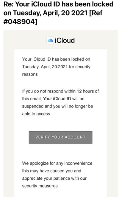 Again the ploy is similar to the Microsoft phishing email example above. The phishing email claims the recipient has been locked out of their iCloud account for security reasons, and the recipient needs to click a link to rectify the problem.