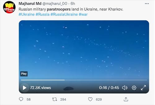 The below video claims to show paratroopers landing in Kharkov, Ukraine. The video was even reported on by India News.