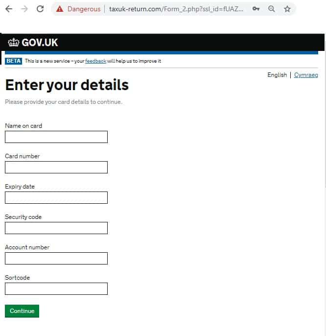 However it isn’t. It’s a spoof website set up by scammers. While the look and feel of the site may look like the HMRC website, the site is designed and set up by cyber crooks, and any information you enter into it is send directly to the crooks. It’s identity fraud.