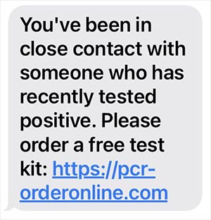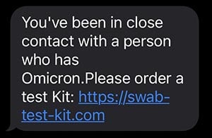 A series of scams are spreading via SMS text messages that claim the recipient has been in close contact with someone with the Omicron COVID-19 variant and must click a link to order a PCR test immediately.