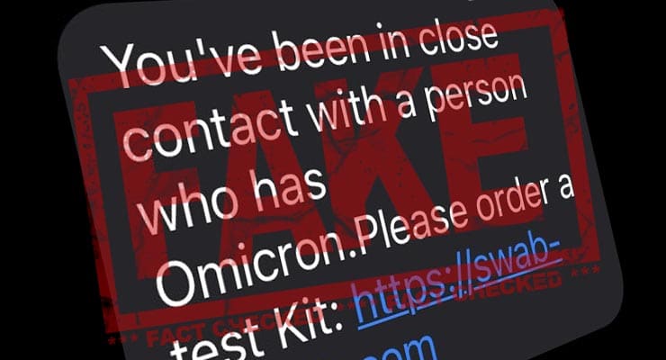 A series of scams are spreading via SMS text messages that claim the recipient has been in close contact with someone with the Omicron COVID-19 variant and must click a link to order a PCR test immediately.