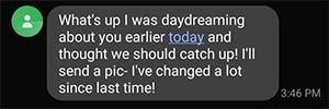 What’s up I was daydreaming about you earlier today and thought we should catch up! I’ll send a pic- I’ve changed a lot since last time!