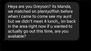 Heya are you Greyson? Its Manda, we matched on plentyoffish before when I came to come see my aunt but we didn’t meet 4 lunch,, im back in the area right now if u wanted to actually go out this time, are you available?