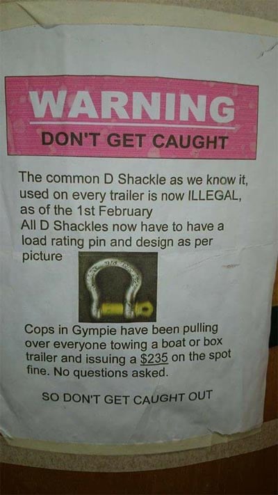 An image of a poster that claims police are issuing on-the-spot fines for motorists using the “common D shackle” is spreading. The poster claims the common D shackle is illegal and motorists must now use a shackle with a special load rating pin.