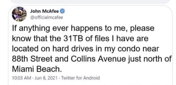 (McAfee did make a claim about having 31TB of information concerning corruption back in 2019, which likely spawned the above fake tweet – however this was not connected to the condo collapse in Miami.)