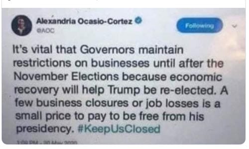 This in turn inevitably damages the economy of the countries that place such restrictions. The screenshot above, apparently posted by congresswomen (and frequent target of Trump) Alexandria Ocasio-Cortez, asks governors to keep such restrictions in place to keep the economy down and thus shrink President Trump’s re-election chances.