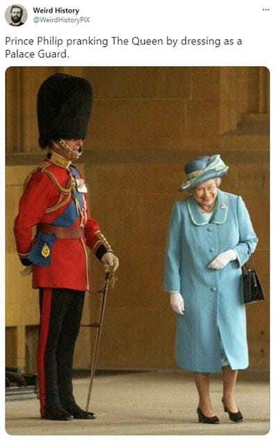 A photo of Queen Elizabeth II and her husband Prince Philip are circulating online that claim to show the moment Philip pranked the queen by dressing up as a Palace Guard.