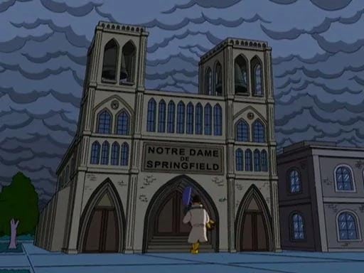 Notre Dame appears in the 2007 episode Husbands and Knives, and the screenshot of the building that has been used by this hoax shows the moment when Homer (who has had plastic surgery) carried Marge into Notre Dame only to be pursued by town-folk carrying fire and pitchforks.