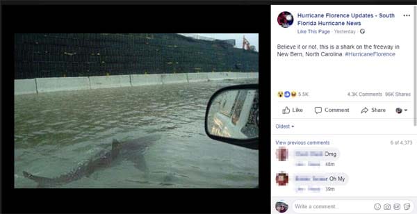 An image of a shark is spreading across social media along with the claim that it is swimming down the freeway in New Bern, North Carolina in the aftermath of Hurricane Florence (since been downgraded to tropical storm.)