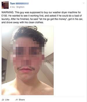 The story seemed extra suspicious when the photo of the “washing machine conman” actually turned out to be one of the original posters Facebook friends.