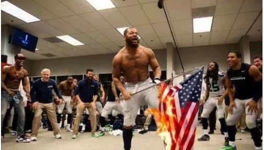 A photo is spreading that appears to depict Seattle Seahawks defensive player Michael Bennett burning the United States flag in the locker room.