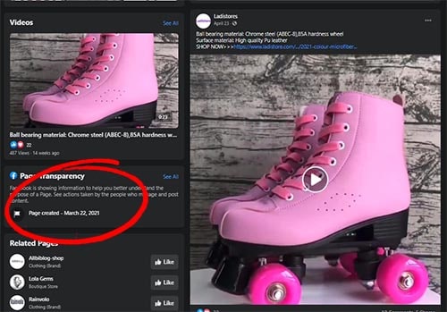 So for example we saw a sponsored ad from a Facebook page called Ladistores claiming to sell cheap roller skates. The Page Transparency tool reveals the page is only 4 months old. (See below.)