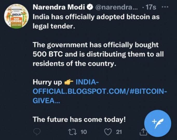 Indian Prime Minister Narendra Modi’s Twitter account – with over 73 million followers – was once again posting unauthorised messages leading to scam websites. This time, the Prime Minister’s account was falsely claiming India was adopting Bitcoin as legal tender and urged users to click a link to get their hands on their share of 500 Bitcoins purchased by the Indian government (below.)