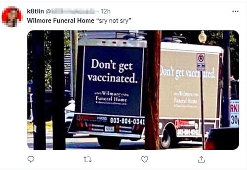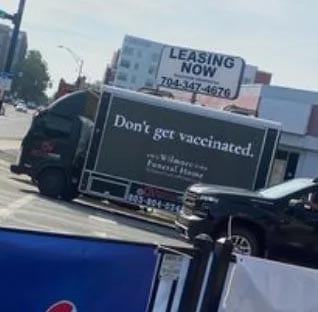 The image, below, has the words “don’t get vaccinated” printed on the sides, along with the company name and website right below, Wilmore Funeral Home.