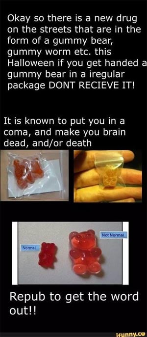 Gummi Bears – of course – are not always the candy quoted in the many different warnings that have spread previously. Razor blades in Toffee Apples, needles in lollies, hard candy disguised as ecstasy and a variety of other descriptions have all been given as the latest “candy to watch out for” over the years but none of these warnings have ever proved accurate.