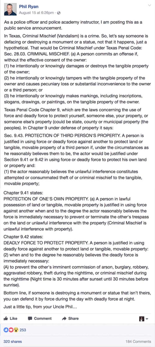 On August 15th 2017, Phil Ryan posted the below message that quoted the Texan Penal code, with the “bottom line” that it is legally acceptable to use deadly force to prevent vandals attacking statues (given the timing of the message, it seems plausible that Ryan posted the message to refer to Confederate statues)