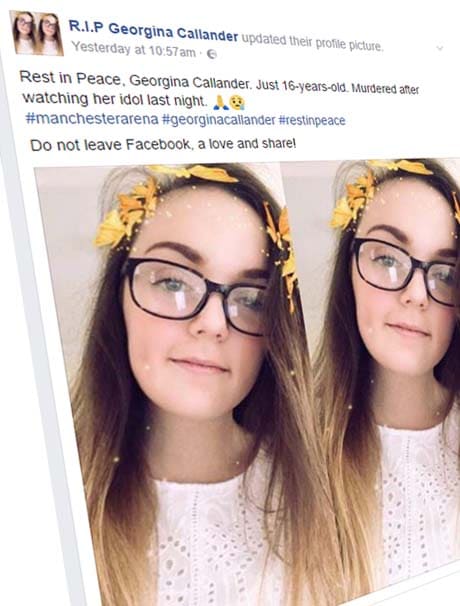 Soon after the identity of one such victim was released to the public – that of 18 year old self-professed Ariana Grande superfan, Georgina Callander – an RIP Facebook page appeared claiming to have been created by her “best friend”. The posts were heartfelt messages, but also asked Facebook users to “love and share” them.