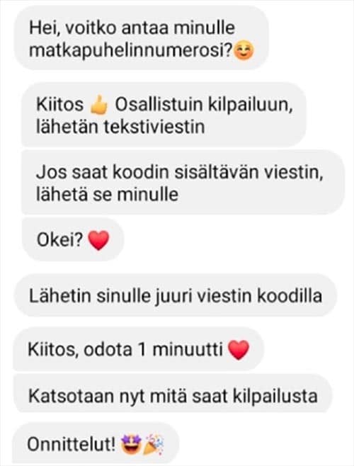 Here is a screenshot of a conversation released by the Finnish National Cyber Security Centre (translation below) of the scam in action.
