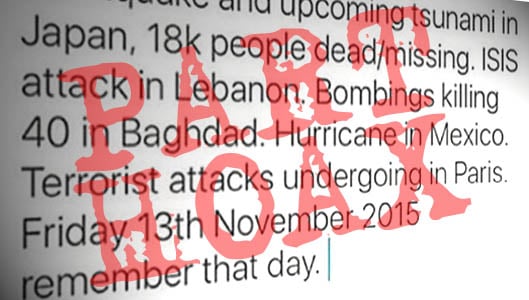 The message outlines some genuine events, such as the attacks in Paris, Baghdad and Lebanon, that really happened on Friday November 13th 2015. The hurricane in Mexico – presumably referring to hurricane Patricia – actually occurred in October 2015.