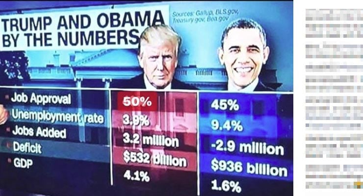 The graphic was showing Trump’s numbers compared side-by-side to Obama’s numbers at the same time in their respective presidencies, around 18 months in (the Obama numbers are not his final numbers, as claimed by some.) You can see the CNN piece here.
