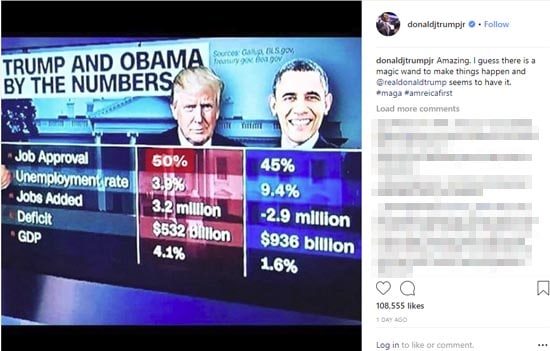 That’s what Donald Trump Jr., son to the current US president, did this week, after he posted a graphic showing CNNs “magic wall” that appears to show Trump’s job approval rating 5% high than that of President Obama’s.