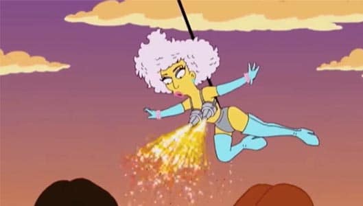 In a 2012 episode of The Simpsons, titled “Lisa Goes Gaga2“, the popular singer does indeed appear in the episode being hoisted above the crowds in a harness wearing a rather outlandish outfit, and this is vaguely visually similar to her Super Bowl half time show in 2017 where she does the same thing.