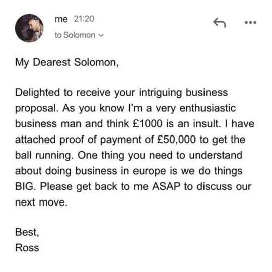 For most of us, we’d simply throw the email in the recycling bin and never think about it again. But Ross decided to try and get his own back, pretending to be “intrigued” by Solomon’s business proposal, and instead offered Solomon a whopping £50,000.