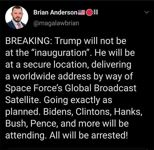 This account known for posting QAnon theories claimed Biden’s Inauguration would turn into a mass arresting event, and Trump would be posting about it using the Space Force Global Broadcast Satellite. Not only that, but this Twitter user had somehow discovered the truth and felt it prudent to broadcast it on Twitter.