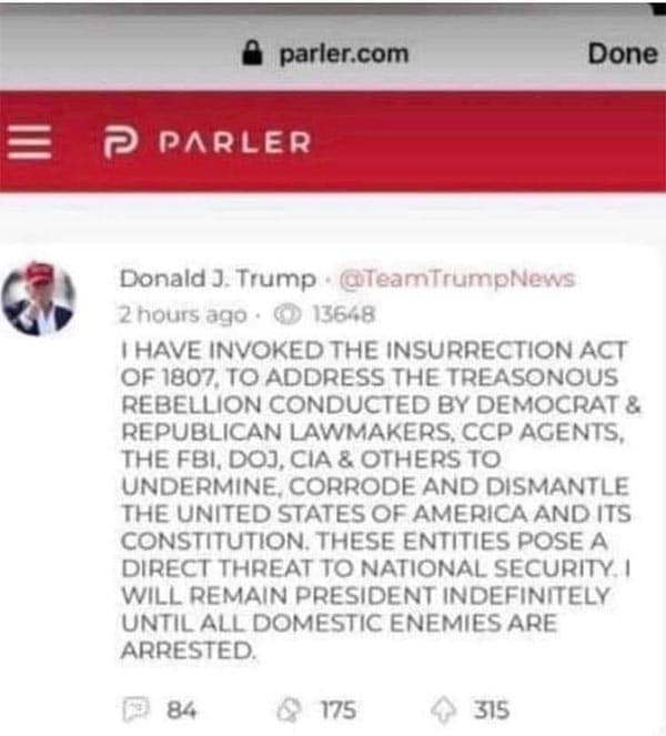 The screenshot above came from social media app Parler, from an account associated with disinformation and QAnon conspiracies. The claim that Trump invoked the Insurrection Act is now demonstrably false, and the claim that Trump would stay on indefinitely would have been false even if he had invoked the act since his term still comes to a close on January 20th. The Insurrection Act does not afford a president the ability to stay on past their presidential term which ends on a specific date as per the US Constitution.