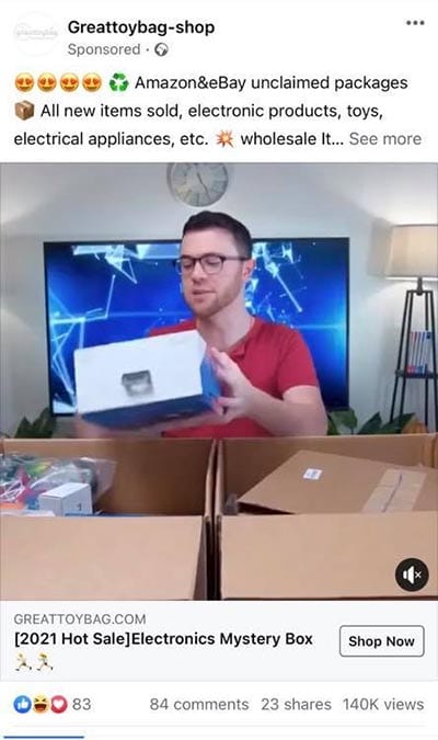 Perhaps the most popular of these was the “Amazon unclaimed packages” scam, where Facebook ads would claim users could pick up cheap electronics and popular items that were returned to Amazon. But instead users would be directed to websites operating in countries like China peddling counterfeit products. (Such ads would also appear elsewhere online, including other social apps such as TikTok.)