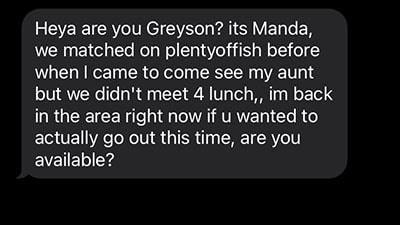 At first glance this could seem like a classic case of mistaken identity. I.e. messages intended for someone else. After the recipient explains they’re not the intended recipient and did not meet the sender on a dating website, the sender them follows up with apologies and flirtatious messages.