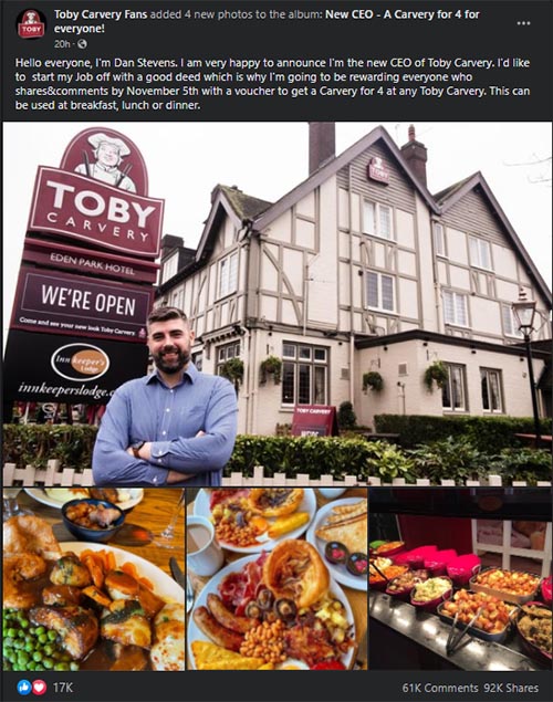 An example of such a post on social media below claims Facebook users can win a voucher for a “Carvery for 4” and is being used to promote a new company CEO.