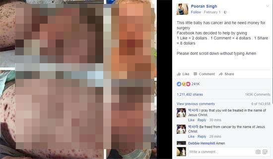We’ve previously discussed about like-farming scammers have sank pretty low in their quest for likes, shares and followers.