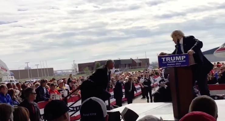 A video is circulating Facebook that shows Donald Trump giving a speech only for it to be interrupted after someone shouts “Allah Akbur”, resulting in startling Trump and the Secret Service who jumping onto the stage.
