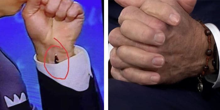 Other rumours claim a wire or microphone can be seen sticking out of Biden’s cuff as he raises his hand to cough. Again this is easily debunked, since the object is almost certainly a part of a rosary that Biden wears on his wrist in memory of his late son.