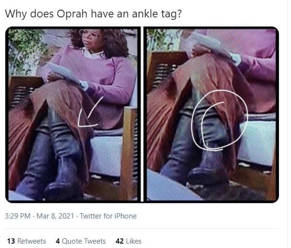 Conspiracies online claim that Oprah Winfrey was wearing an ankle bracelet during her interview with Prince Harry and Meghan Markle in March 2021.