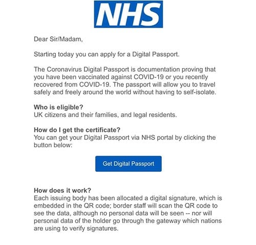 Scammers are attempting to lure UK residents to spoof phishing websites by claiming they can apply for an NHS Digital Passport to prove they have been vaccinated against COVID-19.