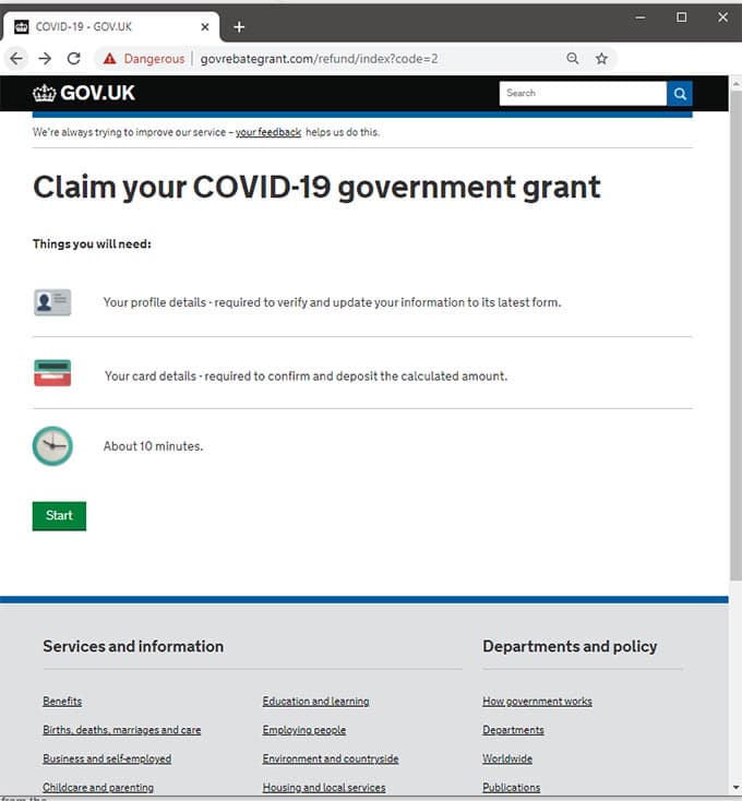 However, while the UK government does indeed have a number of financial aid programs available such as the worker’s furlough scheme, there are no financial aid programs or grants available that require someone click a link in a message and fill out a form in this manner.