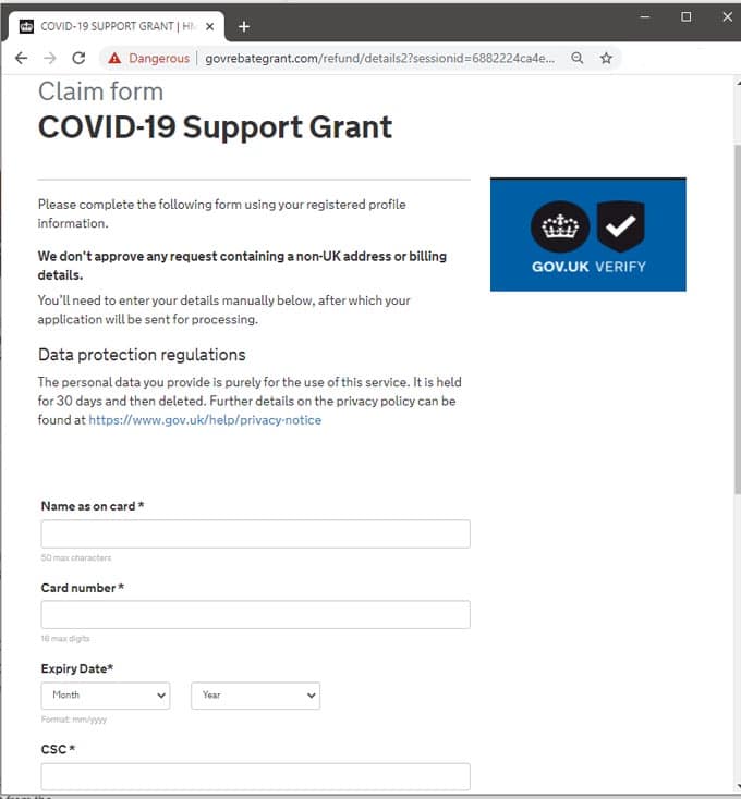 Upon clicking the link in the above message, recipients are directed to a website (see below) that appears to mimick the government’s own website. However it’s a malicious phishing site that, among other things, asks users to enter their credit card information, rendering a victim’s bank accounts vulnerable to fraudulent transactions.